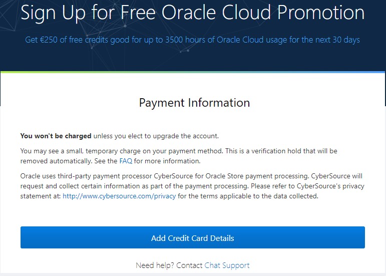 Solution: When registering for oracle cloud, make sure to use the exact address you used when applying for the credit card.
